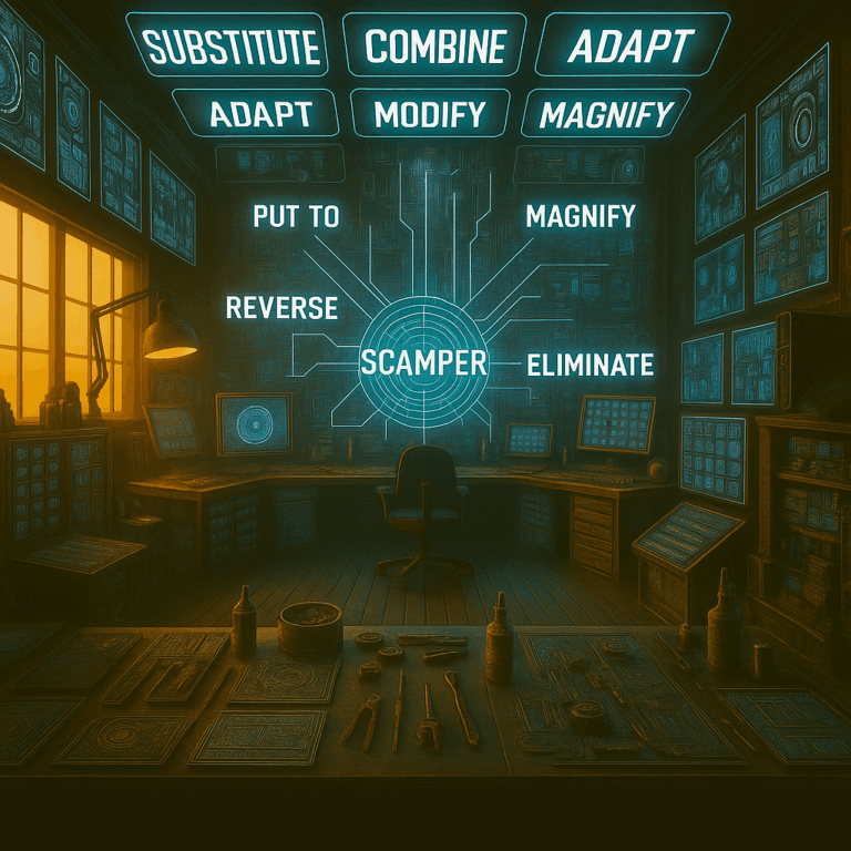 SCAMPER stands for Substitute, Combine, Adapt, Modify, Put to another use, Eliminate, Reverse. It’s a creative reframing tool that helps teams reimagine products, services, or processes.